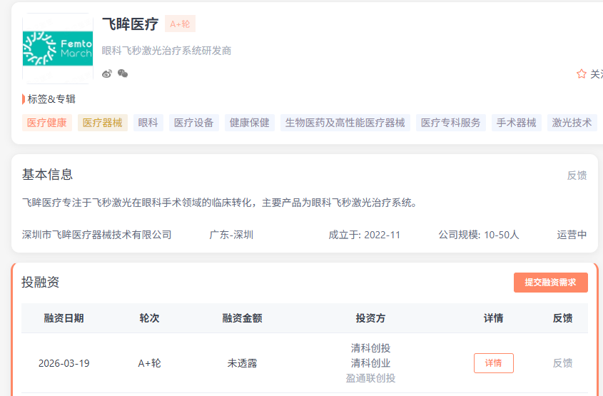 3月19日,飞眸医疗完成A+轮融资,由清科集团领投。公司专注于眼科飞秒激光治疗系统研发,核心部件实现正向研发,聚焦屈光手术这一稳定增长的细分领域。