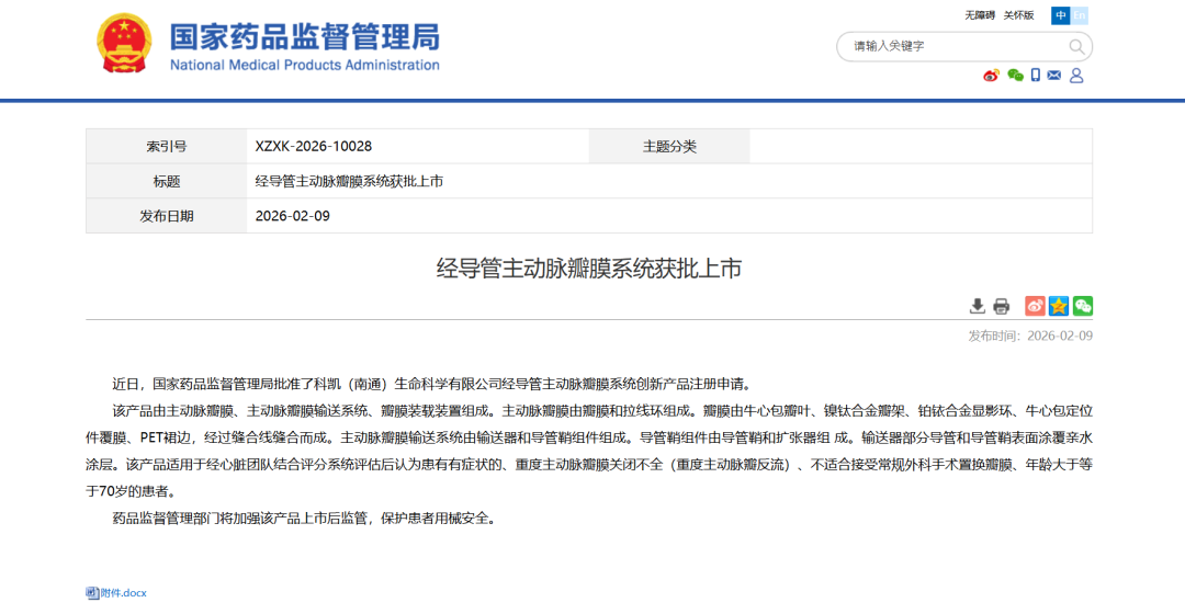 近日,国家药品监督管理局批准了科凯(南通)生命科学有限公司经导管主动脉瓣膜系统创新产品注册申请。