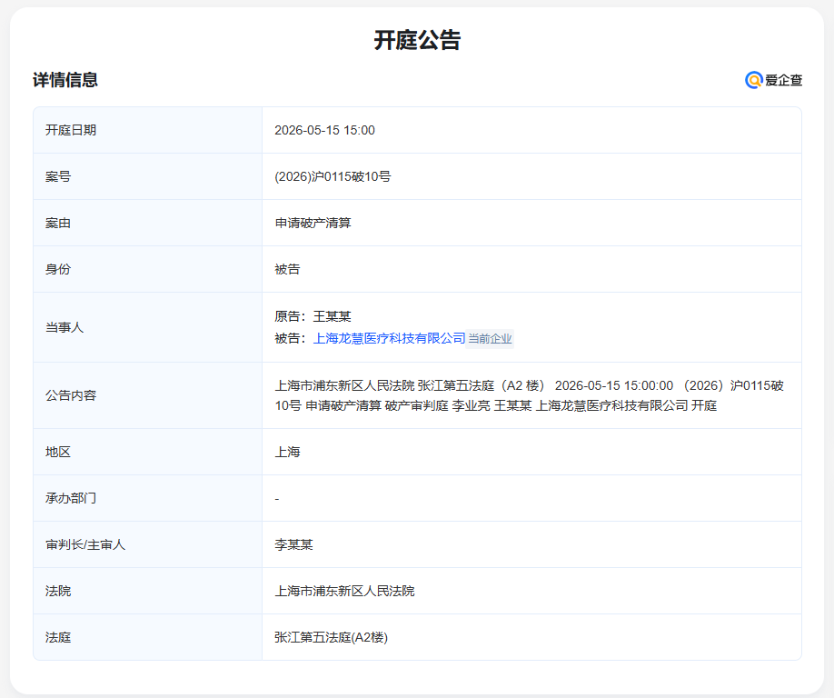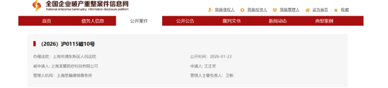 2026年1月23日,上海市浦东新区人民法院近日发布的一纸裁定书,为曾经的张江科学城明星企业上海龙慧医疗科技有限公司(下称“龙慧医疗”)的创业故事画上了一个令人唏嘘的句号。