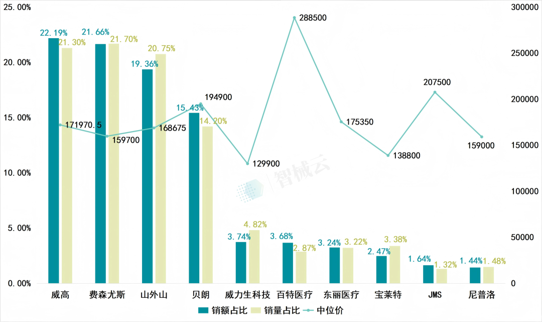 其他品牌价格策略分化也十分显著。百特医疗中位价28.9万元,属于高端小众定位;JMS 聚焦高端赛道;威力生科技中位价13.0元,以高性价比抢占市场。尼普洛、宝莱特处于中端区间。