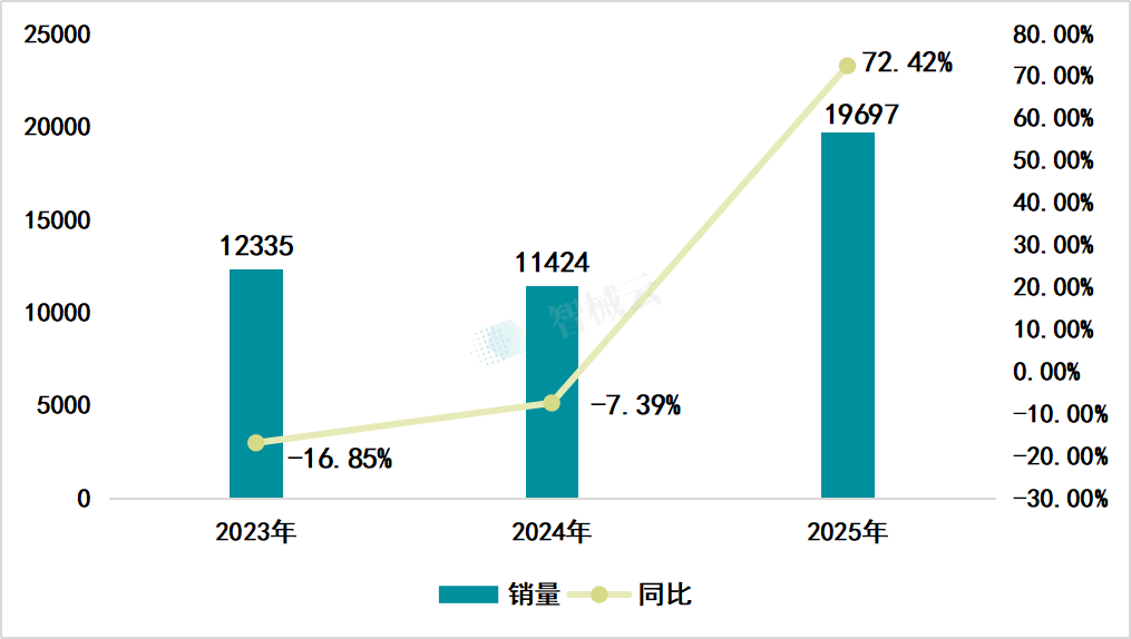 2025年血透设备呈现显著的“量价分化”特征。在经历 2023-2024 年的缩量调整(销量分别下滑 16.85%、7.39%)后,2025 年市场迎来强势放量,全年销量冲至19697 台,同比激增 72.42%。值得关注的是,销量增速大幅领先于销售额,映射出均价下行的行业趋势,“以量换价”成为驱动市场回暖的主要原因之一。