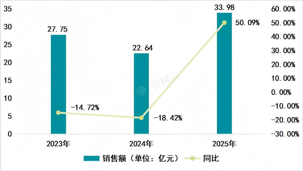 近三年,中国血透设备市场穿透下行周期,实现了由负转正的跨越式增长。2023 至 2024 年行业处于下行调整期,销售额从 27.75 亿元降至 22.64 亿元,同比降幅分别达14.72%、18.42%;行业在 2025 年迎来强力反弹,全年销售额增长至 33.98 亿元,同比增幅 50.09%,不仅弥补前两年下滑缺口,更创下近三年新高,标志着需求侧已进入全面回暖的放量阶段。