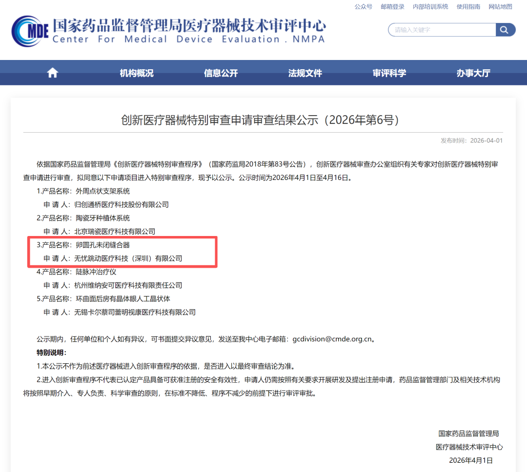 2026年4月1日,国家药监局医疗器械技术审评中心发布了《创新医疗器械特别审查申请审查结果公示(2026年第6号)》,5款医疗器械拟进入国家创新医疗器械特别审查程序。其中,无忧跳动医疗科技(深圳)有限公司申报的“卵圆孔未闭缝合器”赫然在列。