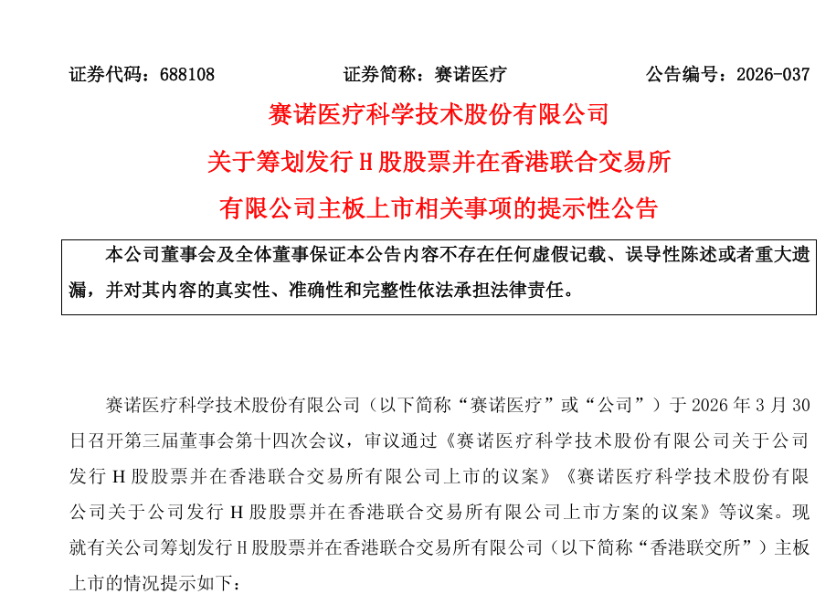 3月30日,科创板上市企业赛诺医疗发布公告,正式启动发行H股并在香港联交所主板上市的筹备工作,迈出全球化资本布局关键一步。此次赴港 IPO,既是公司应对国内集采压力、拓宽国际融资渠道的战略选择,也是其深耕冠脉与神经介入双赛道、加速全球商业化的重要支撑。