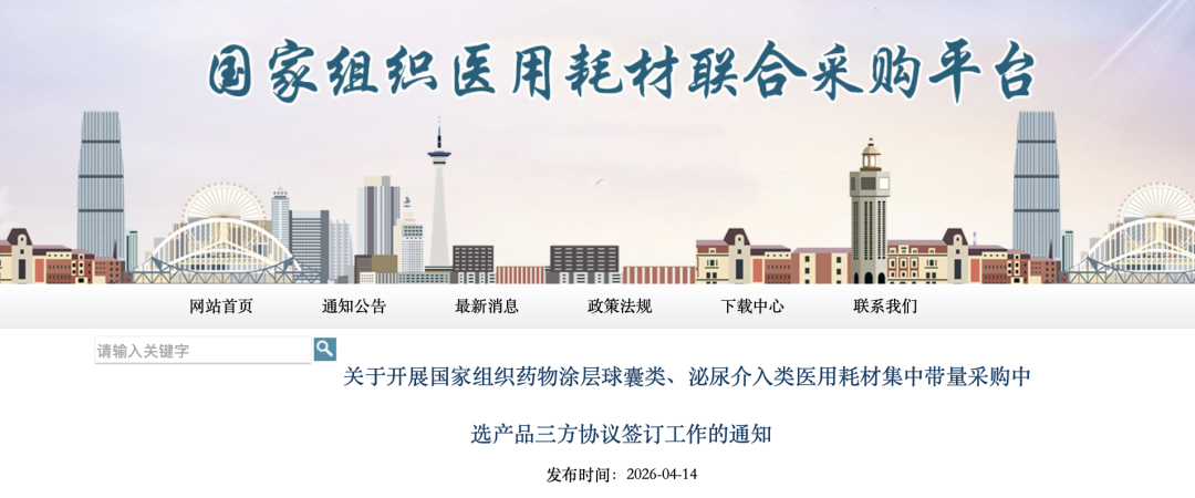 4月14日,国家组织高值医用耗材联合采购办公室发布《关于开展国家组织药物涂层球囊类、泌尿介入类医用耗材集中带量采购中选产品三方协议签订工作的通知》。