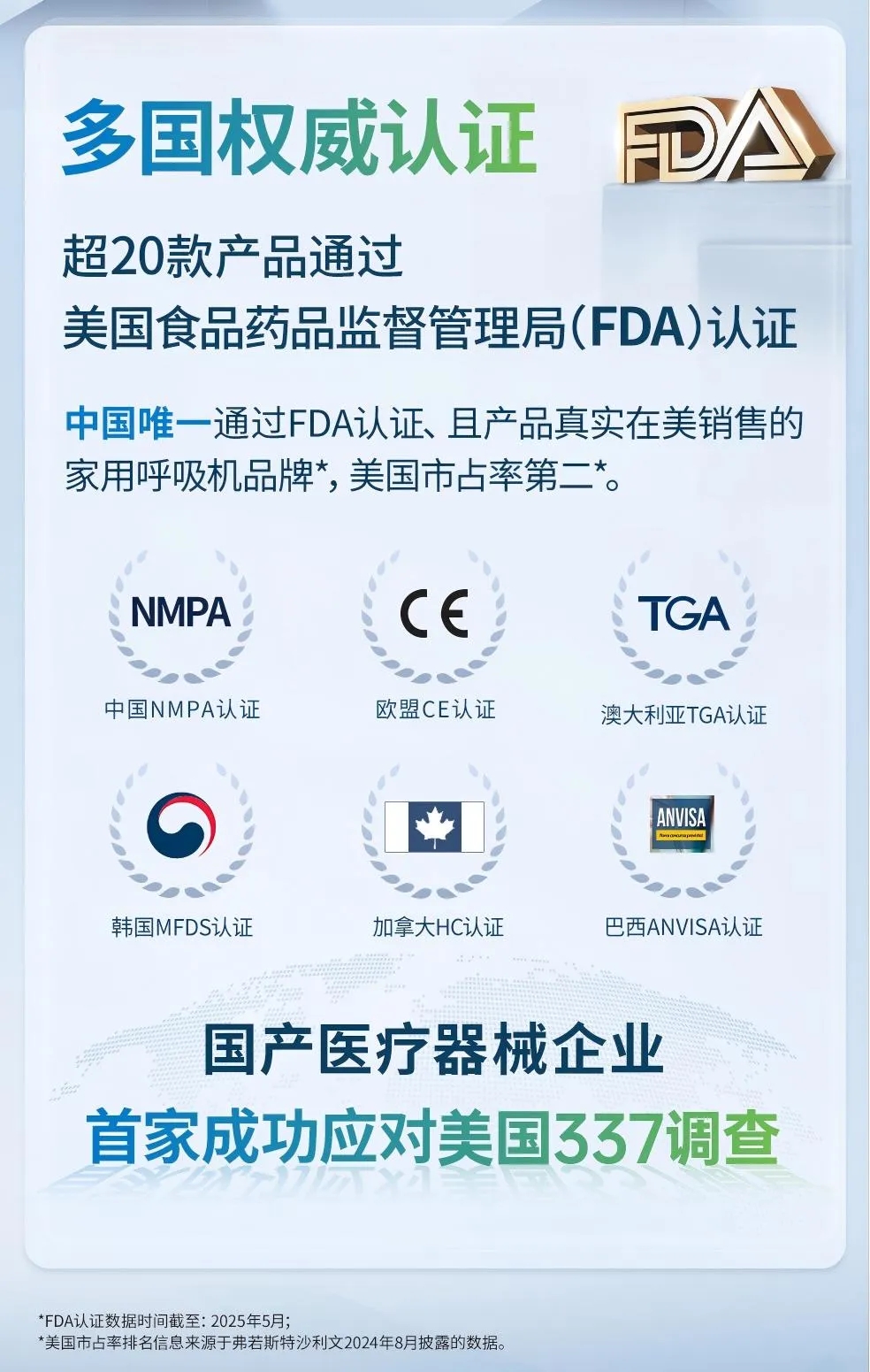 事实上,瑞迈特的全球化布局启动得很早,在2008年就取得了欧盟CE认证,并2012年获得美国FDA认证,成为目前仅有的一家在美国销售的中国家用呼吸机企业,并在2023年美国市场销售占有率达到第二位,在全球这一广阔空间中,获得欧美等发达国家市场的广泛认可,产品技术力得到进一步淬炼。