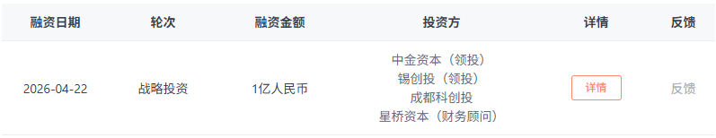 据企查查数据,2025年12月,公司完成D+轮近亿元融资;短短5个月后,再度斩获超亿元战略投资,且领投方升级为中金资本、锡创投等头部机构,老股东成都科创投也选择继续加码,充分彰显了资本市场对其发展前景的高度认可与坚定信心,也为其未来可能的资本化进程奠定了基础。