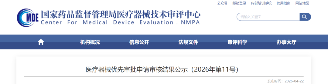 根据《医疗器械优先审批程序》要求,优先审批医疗器械审核办公室将经审核符合优先审批情形的项目予以公示,公示时间为2026年4月22日至4月29日。