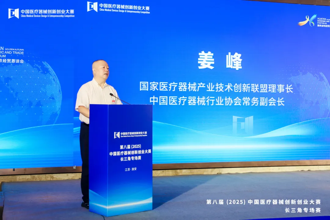国家医疗器械产业技术创新联盟理事长、中国医疗器械行业协会常务副会长姜峰在发言中,首先诚挚感谢江苏省药监局、淮安市政府及清江浦区政府以及大赛主办方“三方协同”对本次大赛的支持。介绍了中国医疗器械创新创业大赛是国内参赛项目最多、专业性最强、行业影响力最大、转化落地效果最突出的全国性专业赛事。本届大赛服务进一步升级,不仅提供自有基金、代工平台、设计平台等配套支持,并与工信部、科技部深化交流,助力国际科研合作与项目落地。大赛组委会更以覆盖赛前、赛中、赛后的全周期服务,为医疗器械创新项目蓬勃发展保驾护航。