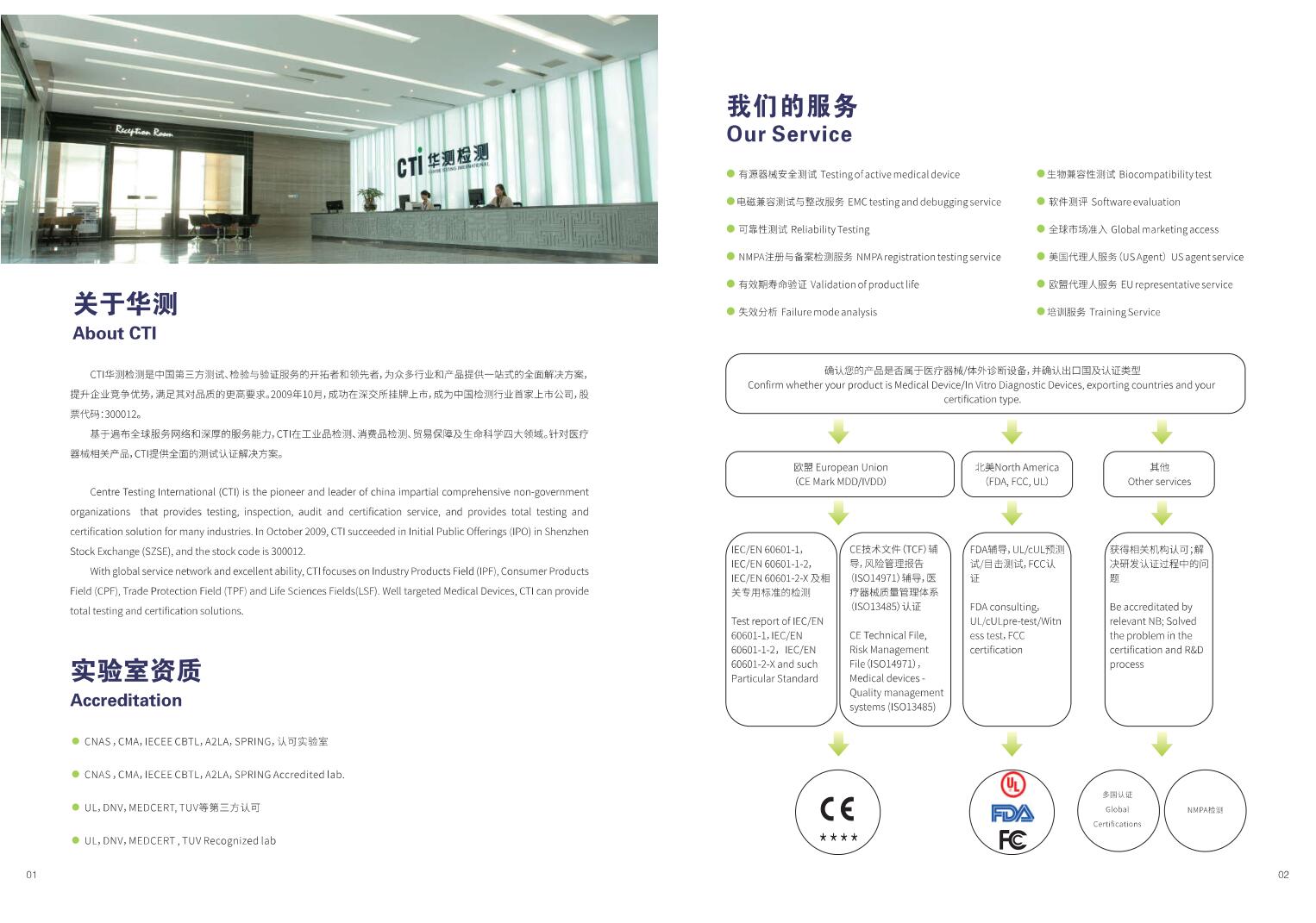 华测检测认证集团股份有限公司(英文"Centre Testing International Group Co., Ltd.",简称"CTI")作为中国第三方检测与认证服务的开拓者和领先者,是一家集检测、校准、检验、认证及技术服务为一体的综合性第三方机构,在全球范围内为企业提供一站式解决方案。 CTI成立于2003年,总部位于深圳,在全国设立了六十多个分支机构,拥有化学、生物、物理、机械、电磁等领域的近130个实验室,并在中国台湾、中国香港、美国、英国、新加坡等地设立了海外办事机构。2009年10月30日,CTI成功在深交所挂牌上市,股票代码:300012,成为中国首批、深圳市首家在创业板上市的公司,也是国内检测行业首家上市公司。