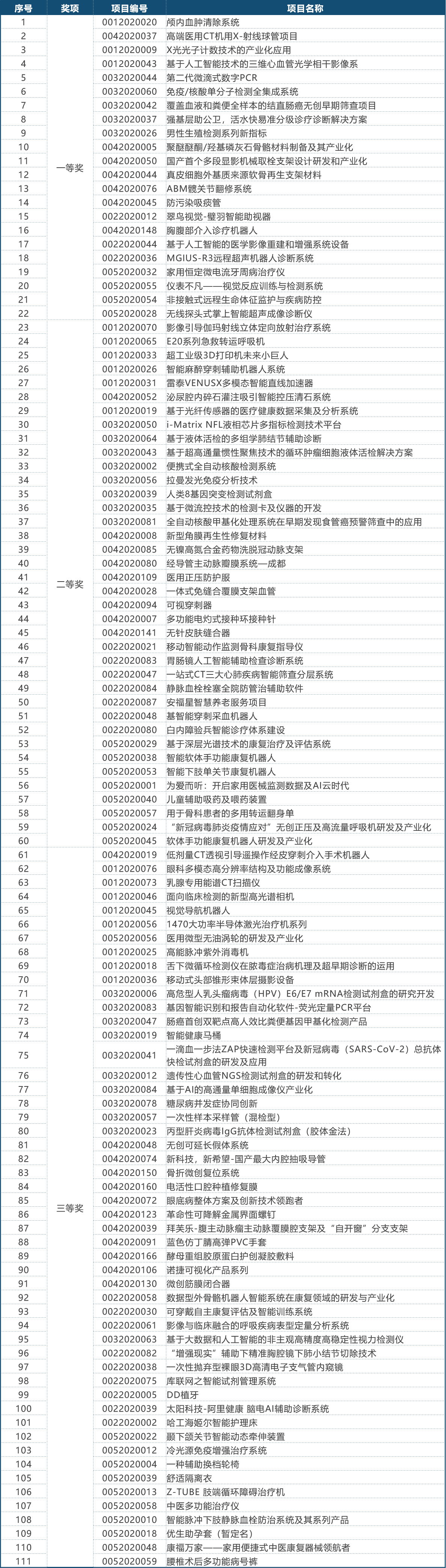 第三届(2020)中国医疗器械创新创业大赛决赛获奖名单