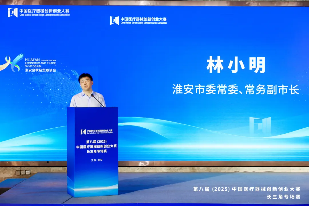 淮安市委常委、常务副市长林小明在致辞中介绍淮安城市定位,既点明 “历史文化名城” 底蕴,也强调宜居宜业特质、独特运河文化、便捷交通枢纽三大核心优势。随后聚焦淮安产业发展:作为 “产业新城”,近年聚力推进新型工业化,优化产业布局、塑造产业生态;列举当地特色产业及集群优势,提及电子信息、装备制造的坚实基础,特别强调生物医药与医疗器械领域的产业积淀,还介绍了当地优质相关企业以展现发展潜力。最后,林市长对淮安医疗器械产业未来寄予希冀,希望有更多的创新企业落地淮安