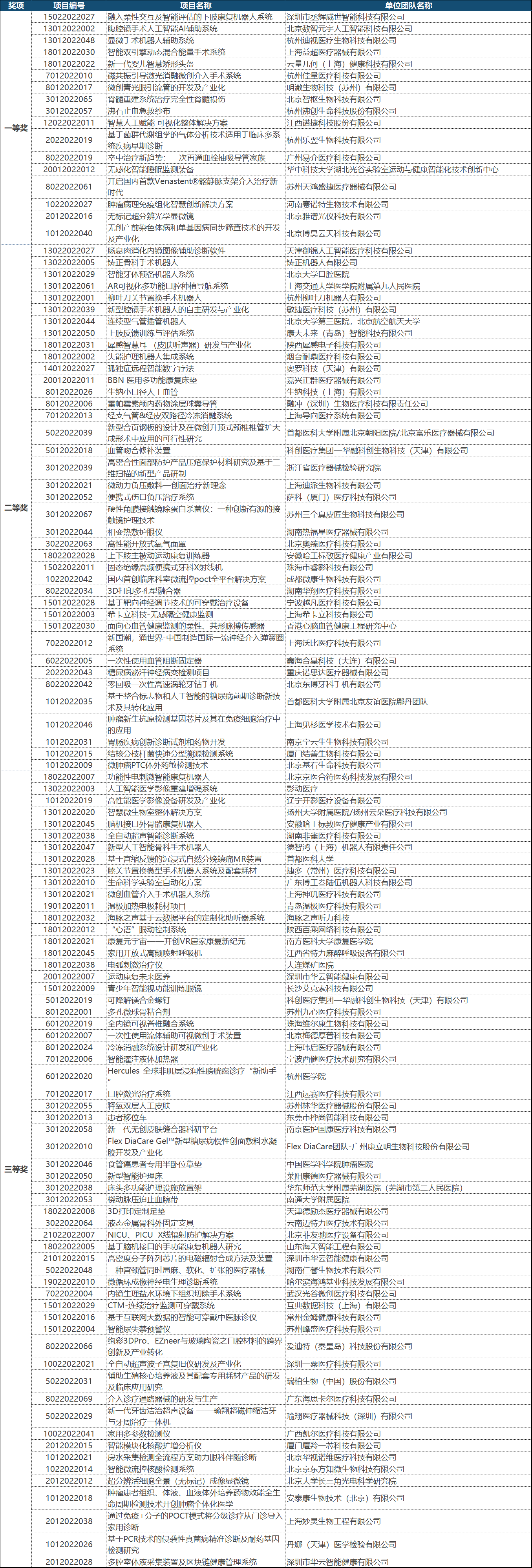 第五届(2022)中国医疗器械创新创业大赛决赛获奖名单