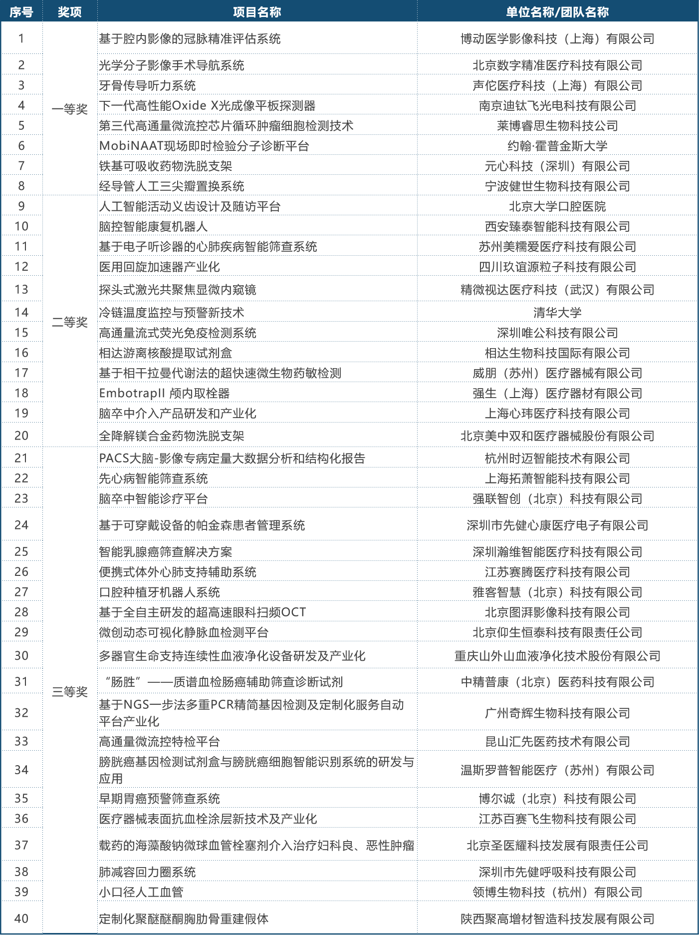 第二届(2019)中国医疗器械创新创业大赛决赛获奖名单